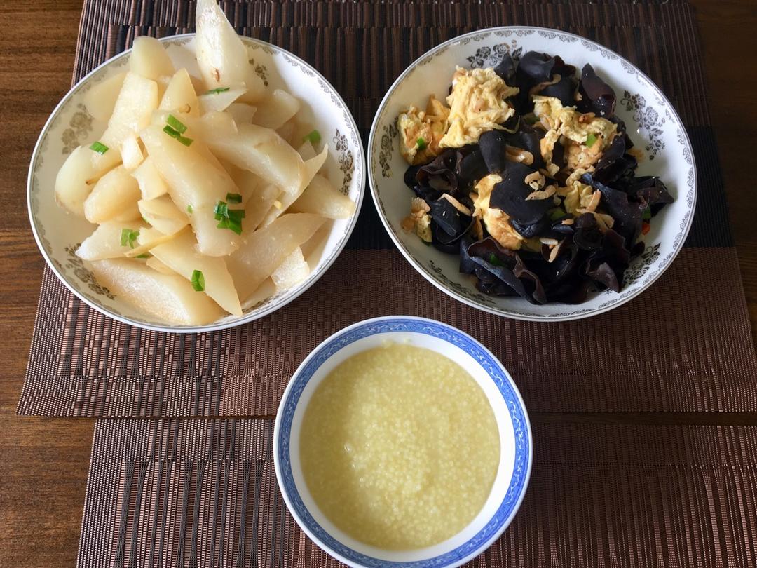 烧萝卜,木耳虾米炒鸡蛋,小米粥