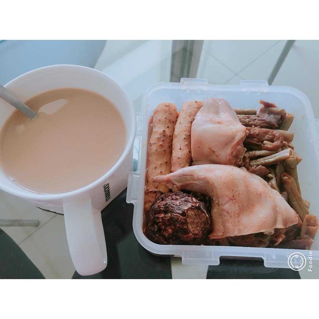 茄子豆角,烤兔腿,蒸山药+蒸芋艿,脱脂拿铁,有氧一小时后的午饭。