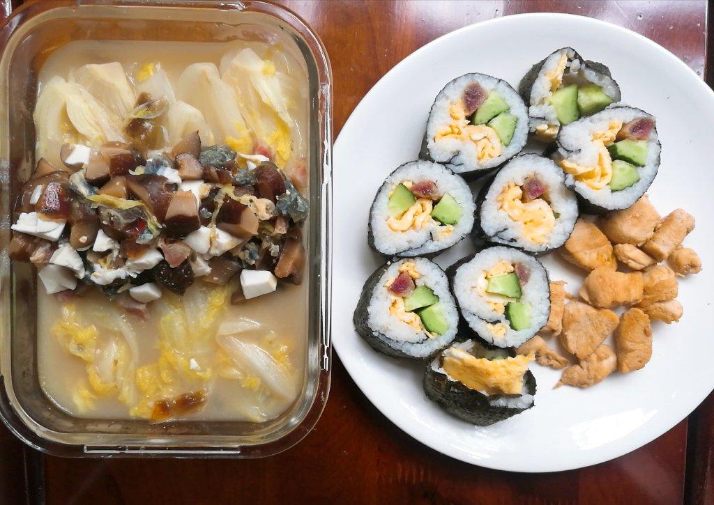 20180818午餐,上汤娃娃菜,紫菜饭卷,孜然鸡胸肉