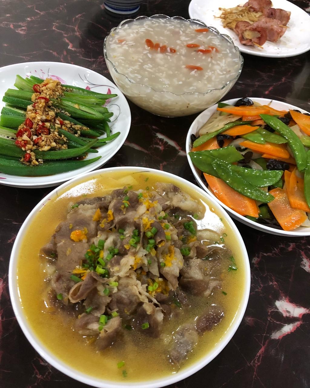 酸汤肥牛,蒜蓉秋葵,荷塘小炒,酒酿圆子
