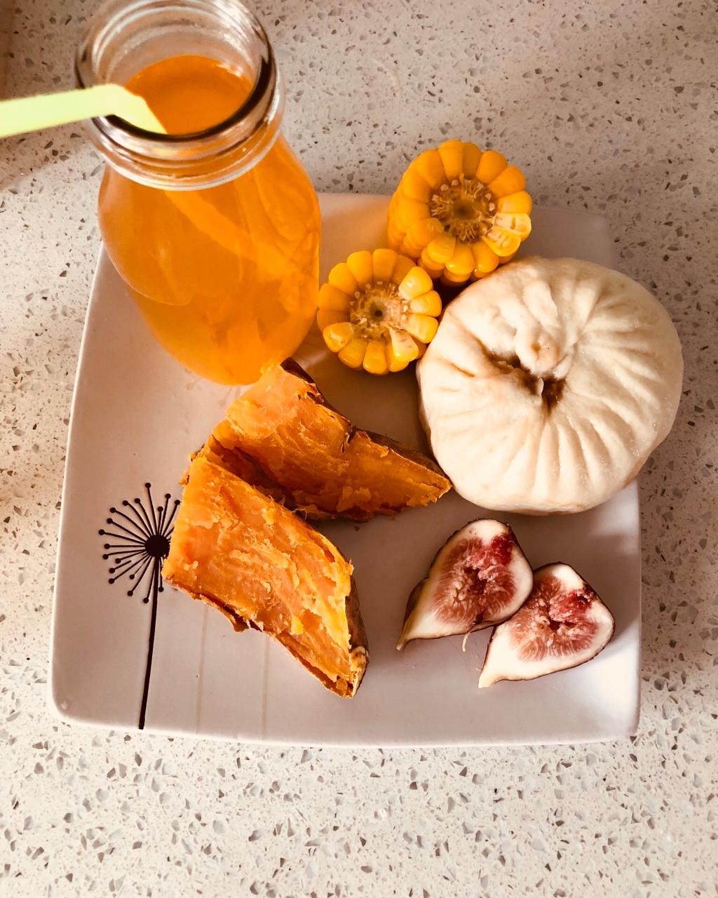今日早餐:鲜肉包、玉米、烤红薯、无花果、橙汁