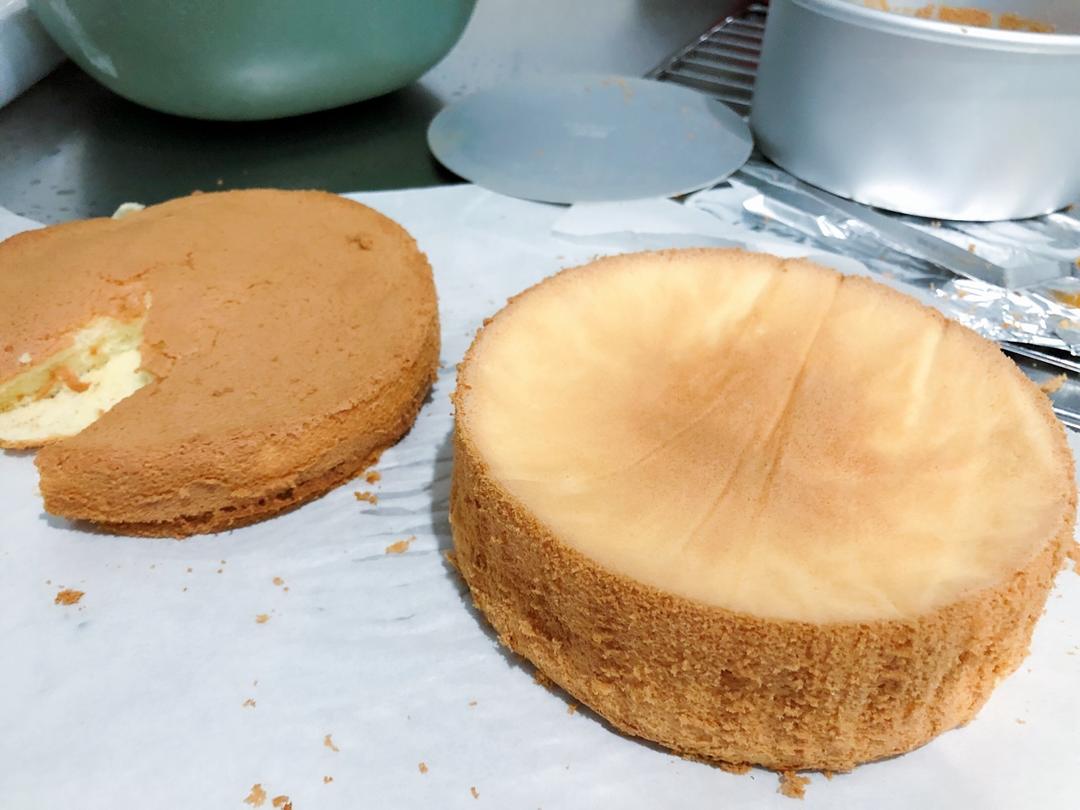 cherr-yan 做过 超简单完美戚风蛋糕(6寸2蛋)附打发、翻拌、脱模视频 做了两个是一个出模失败,变成了饼🤣第二个看起来算成功了吧,可是底部有点塌.... #早餐•2018年8月30日# 2018-08-30