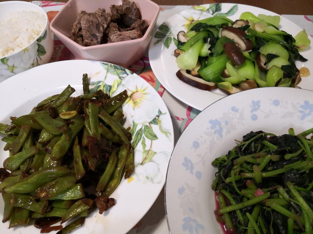 红苋菜+油菜表香菇+炒四季豆+酱牛肉