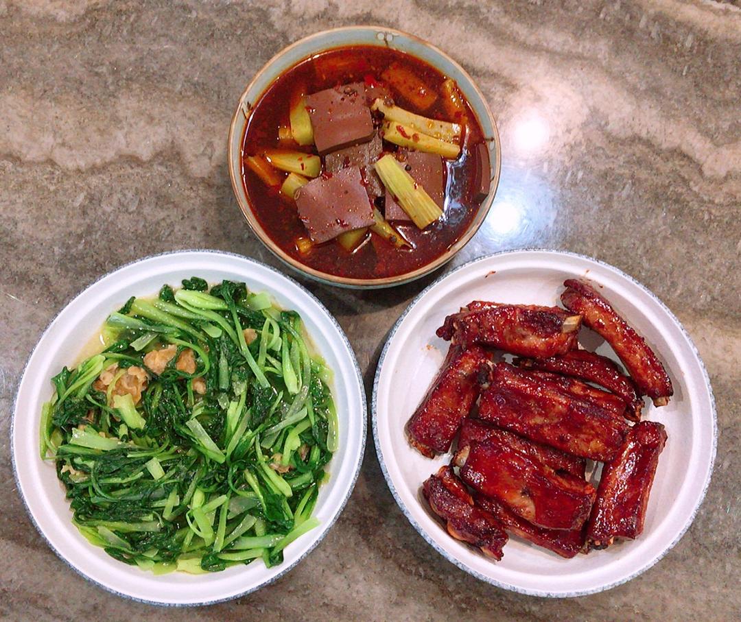 麻辣鸭血、秘制烤排、油渣炒毛菜