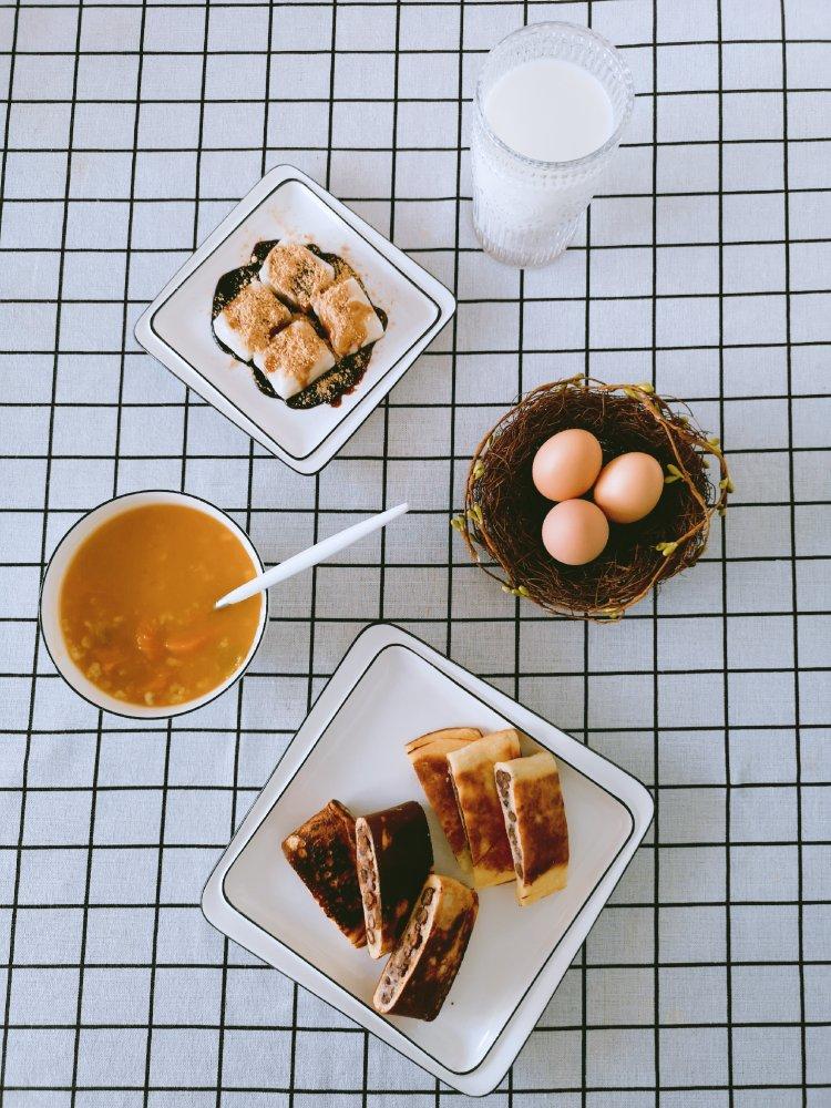 ヾ(●´∇`●)ノ哇~黄豆粉红糖年糕,燕麦米糙米南瓜粥,红豆饼,燕麦米牛奶,白煮蛋