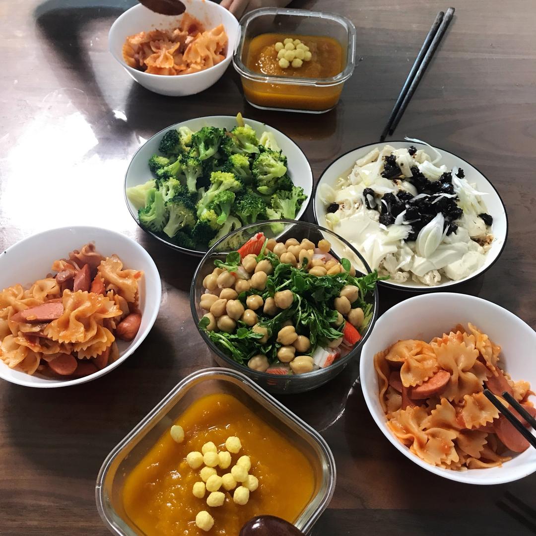 8月某日午,蟹肉鹰嘴豆沙拉,举行豆腐蒸,香肠意面,南瓜汤