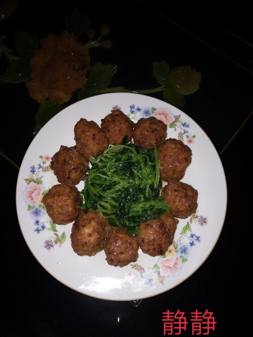 肉圆炒小青菜,我婆婆自己炸的。