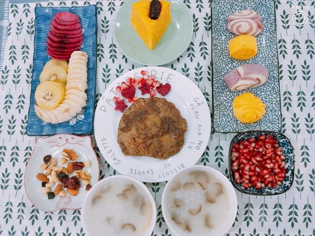 海参粥,煎牛排,南瓜馒头,紫薯馒头,南瓜发糕。