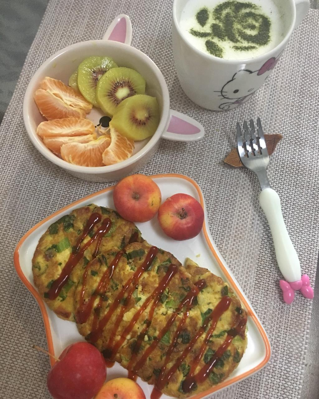 早餐,豆腐饼,水果,热抹茶泡泡奶