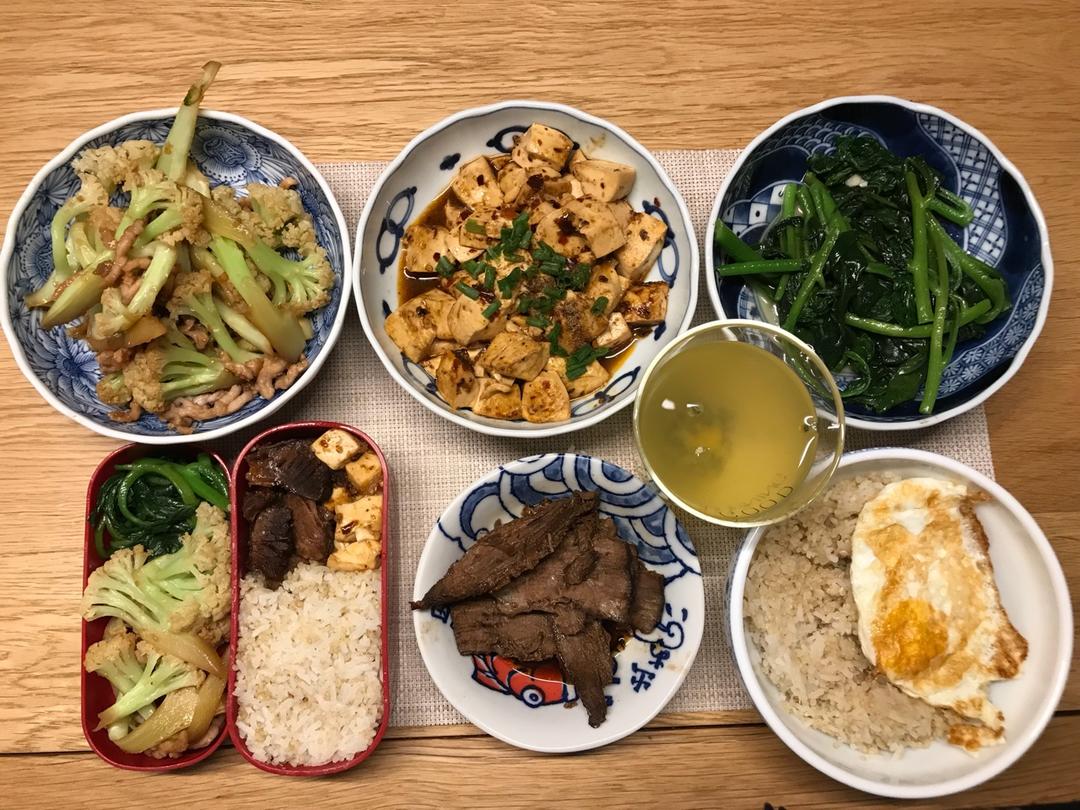 肉丝炒菜花,麻婆豆腐,清炒木耳菜,卤牛腱,荷包蛋,藜麦饭,百香果蜂蜜水