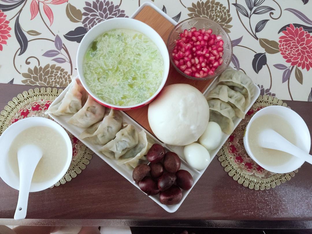 南瓜韭菜蒸饺,大馒头(没吃),水煮蛋,虾仁鸡蛋糕,小米粥,板栗(没吃完),石榴
