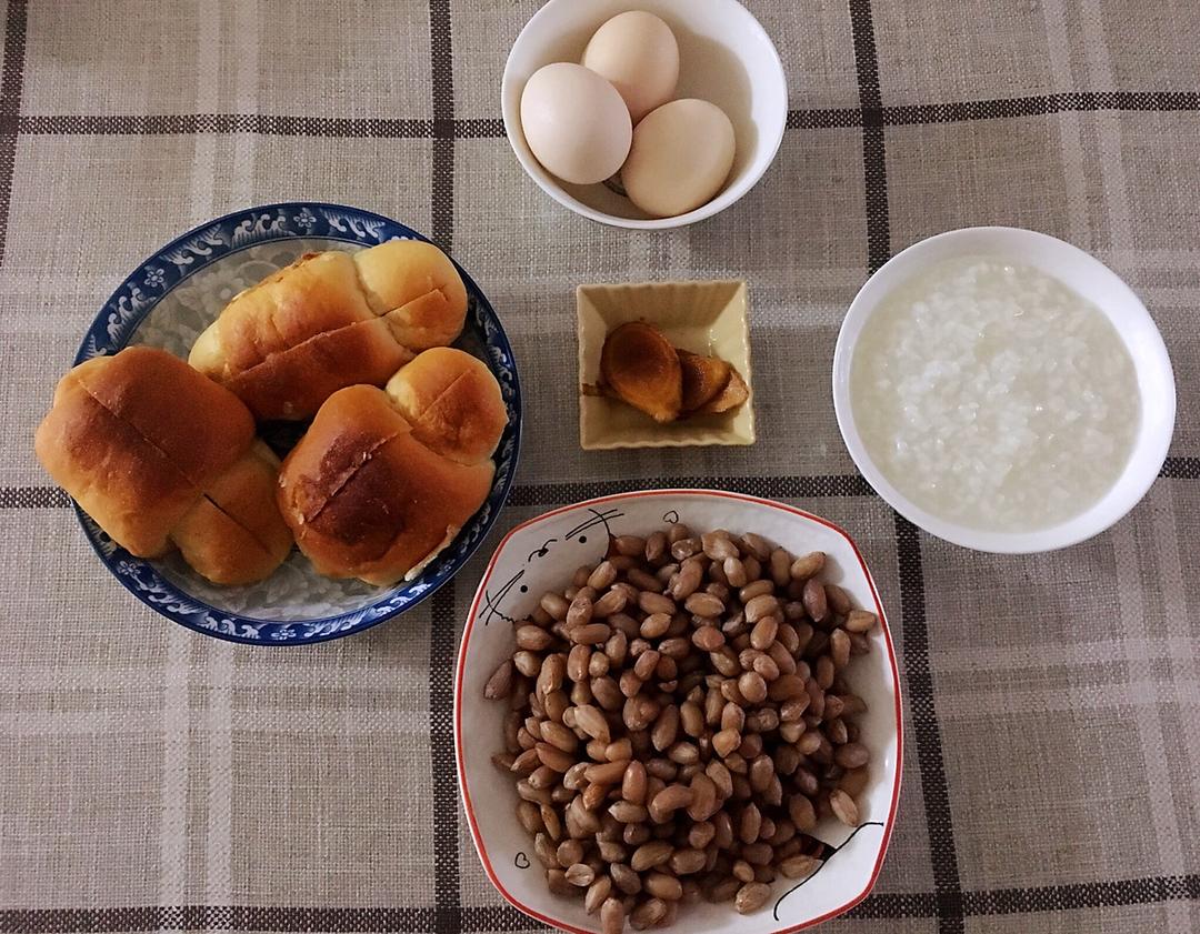 混搭:炼乳夹馅面包 甜醋仔姜 盐水花生 白粥和水煮蛋