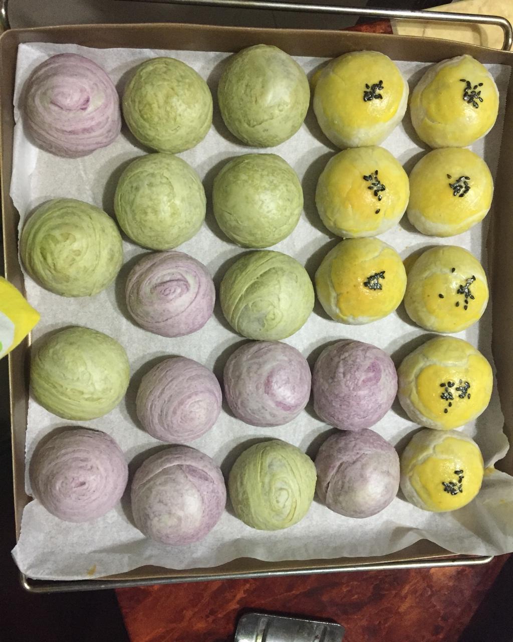 蛋黄酥~紫薯、抹茶、原味~花好月圆,中秋快乐~内附一次做六色蛋黄酥方法~