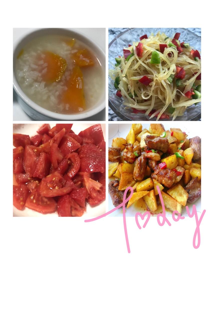 今天的晚餐——红薯稀饭,凉拌土豆丝,凉拌西红柿,椒盐土豆排骨