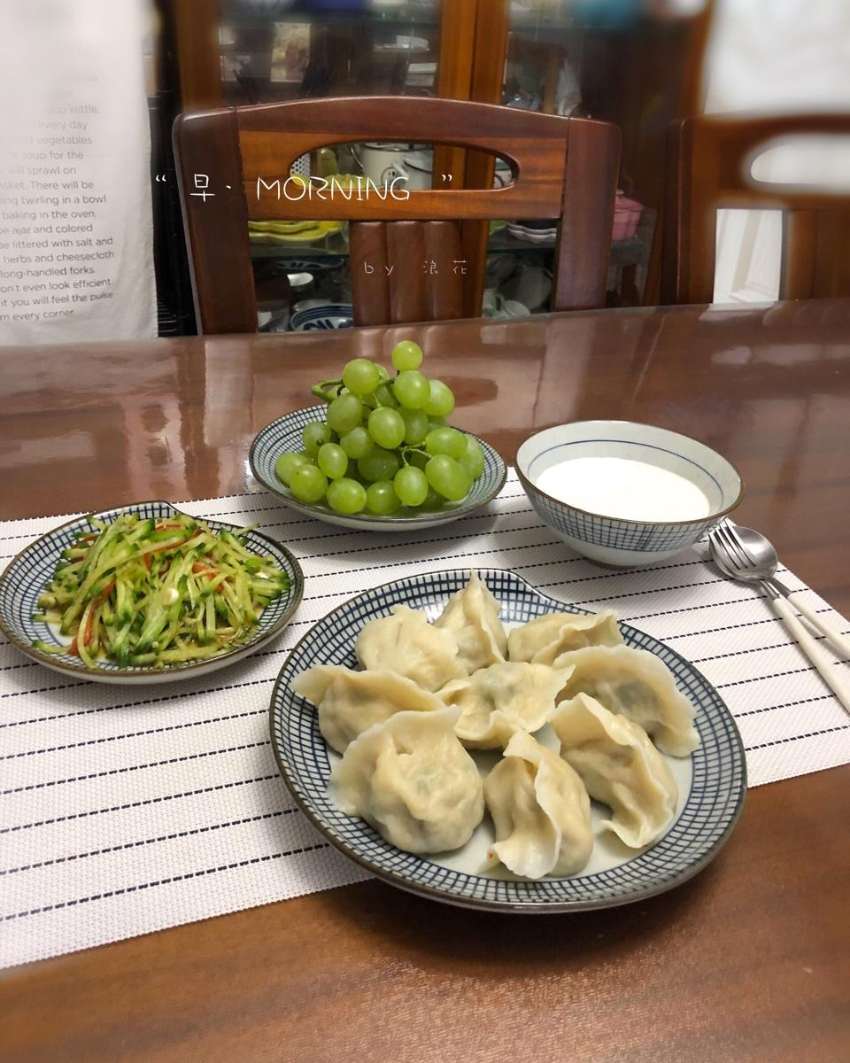 早饭~~凉拌萝卜丝、海鲜饺子、酸奶、葡萄。早上好🌹
