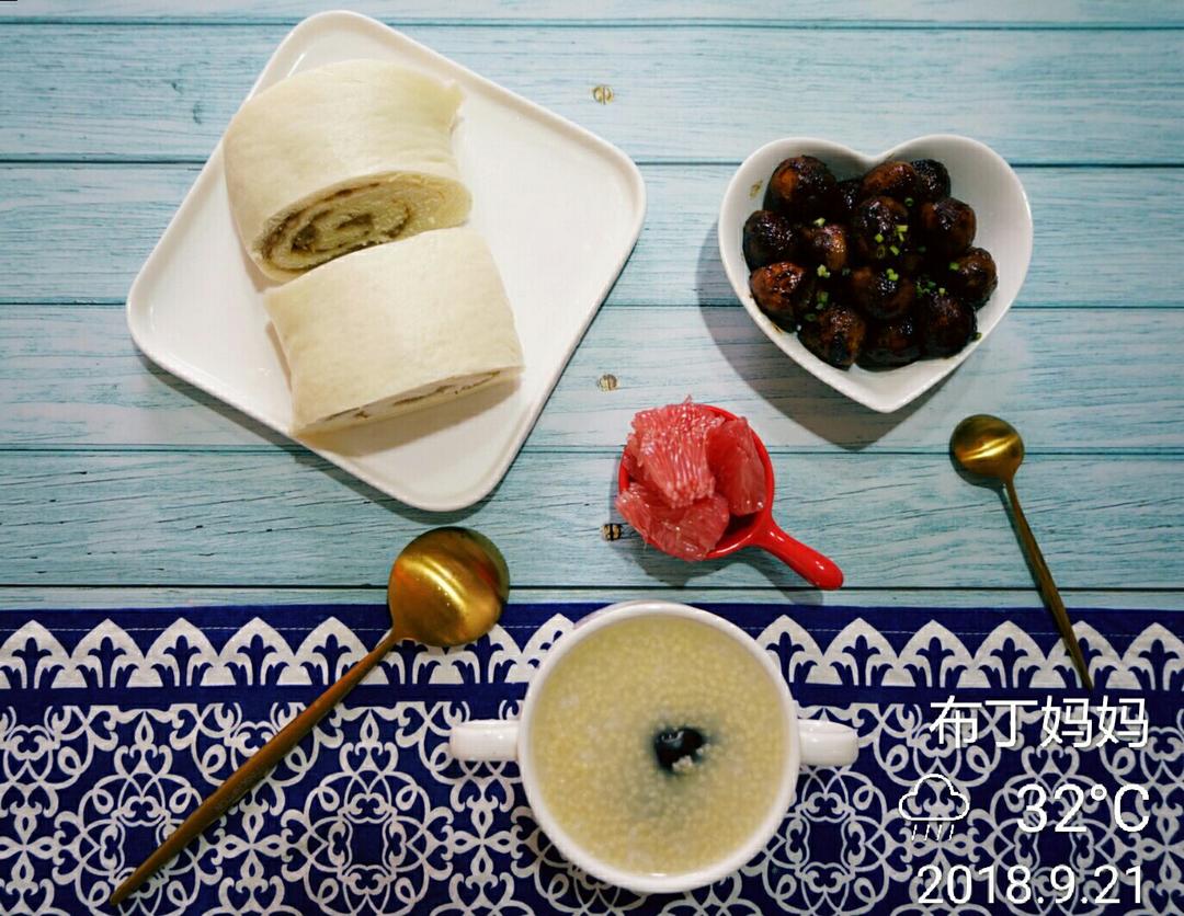 肉龙昨晚睡前蒸好的,早上回炉一下切段,搭配小米粥,味道不错。