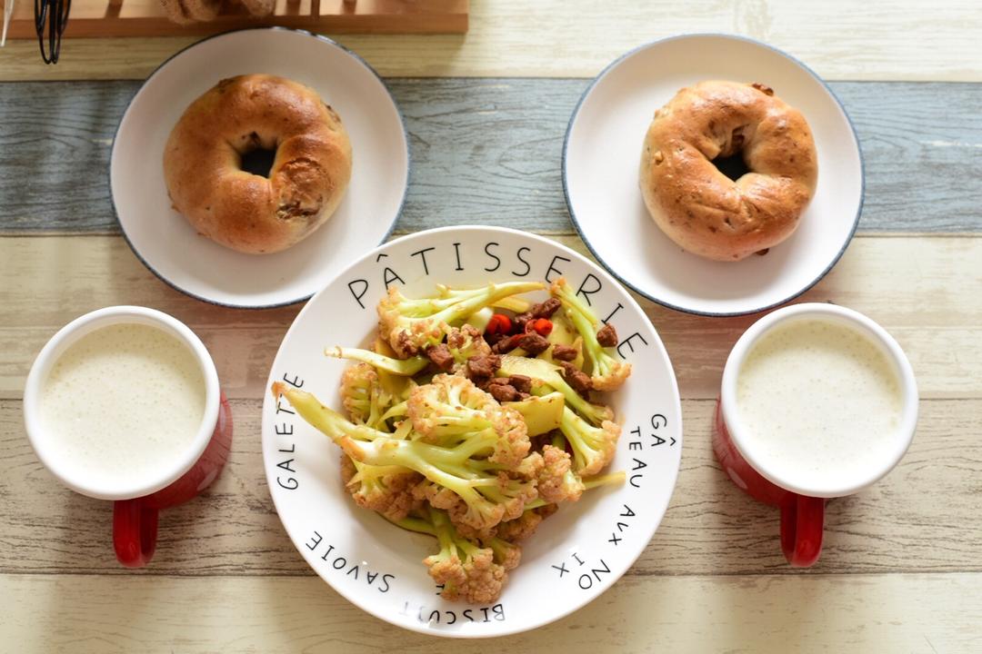 核桃贝果,肉末花菜还有香蕉牛奶~