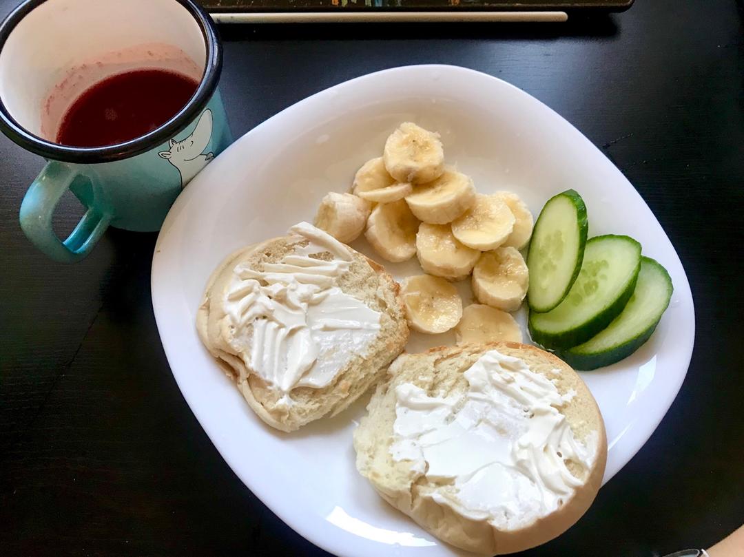 长得像舒芙蕾的面包 切开烤一烤 涂上混合芝士&酸奶&奶油的一种酱 配黄瓜好吃 配香蕉有点腻