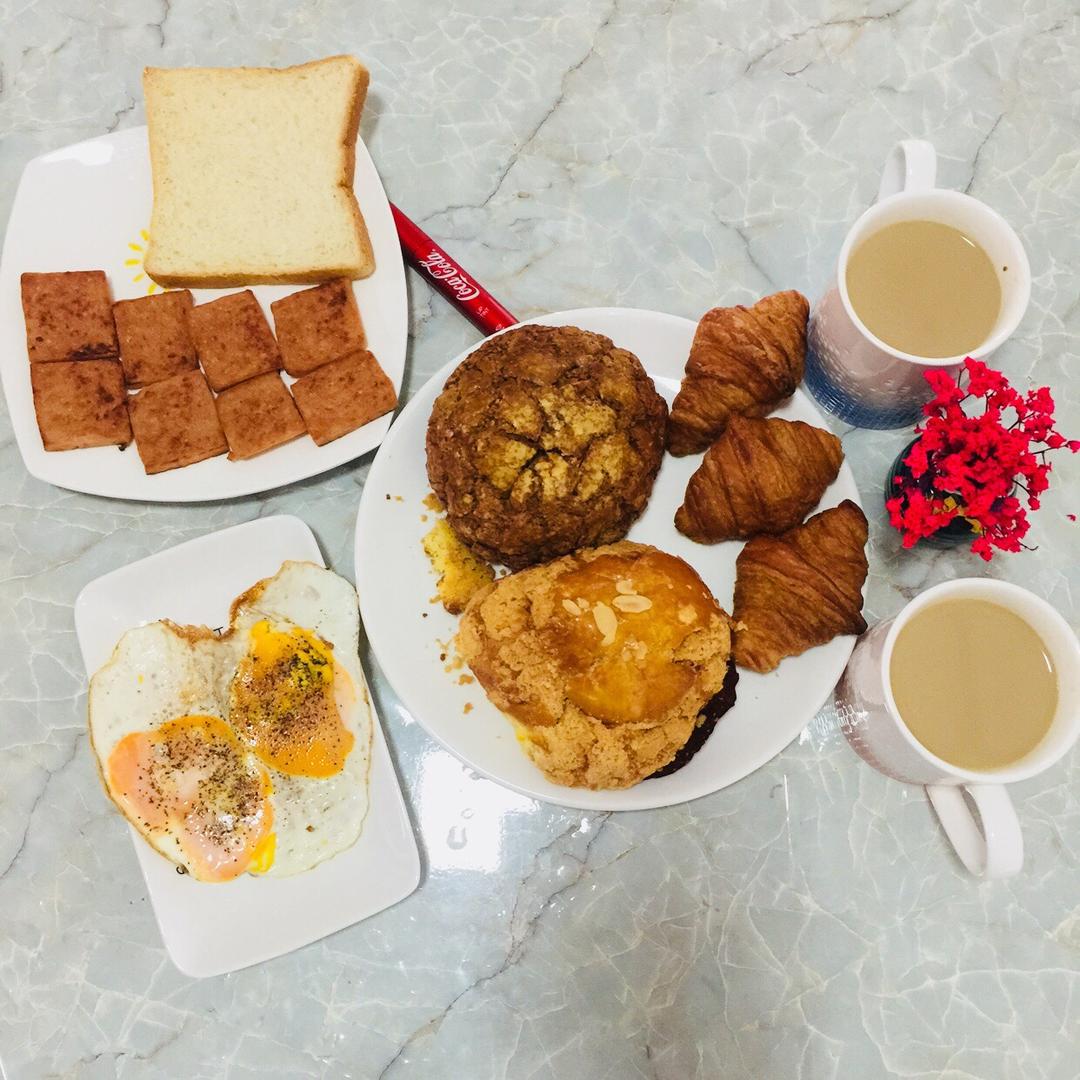 咖啡 奶酥菠萝包 咖啡菠萝包 小牛角 全麦切片面包 煎午餐肉 煎蛋