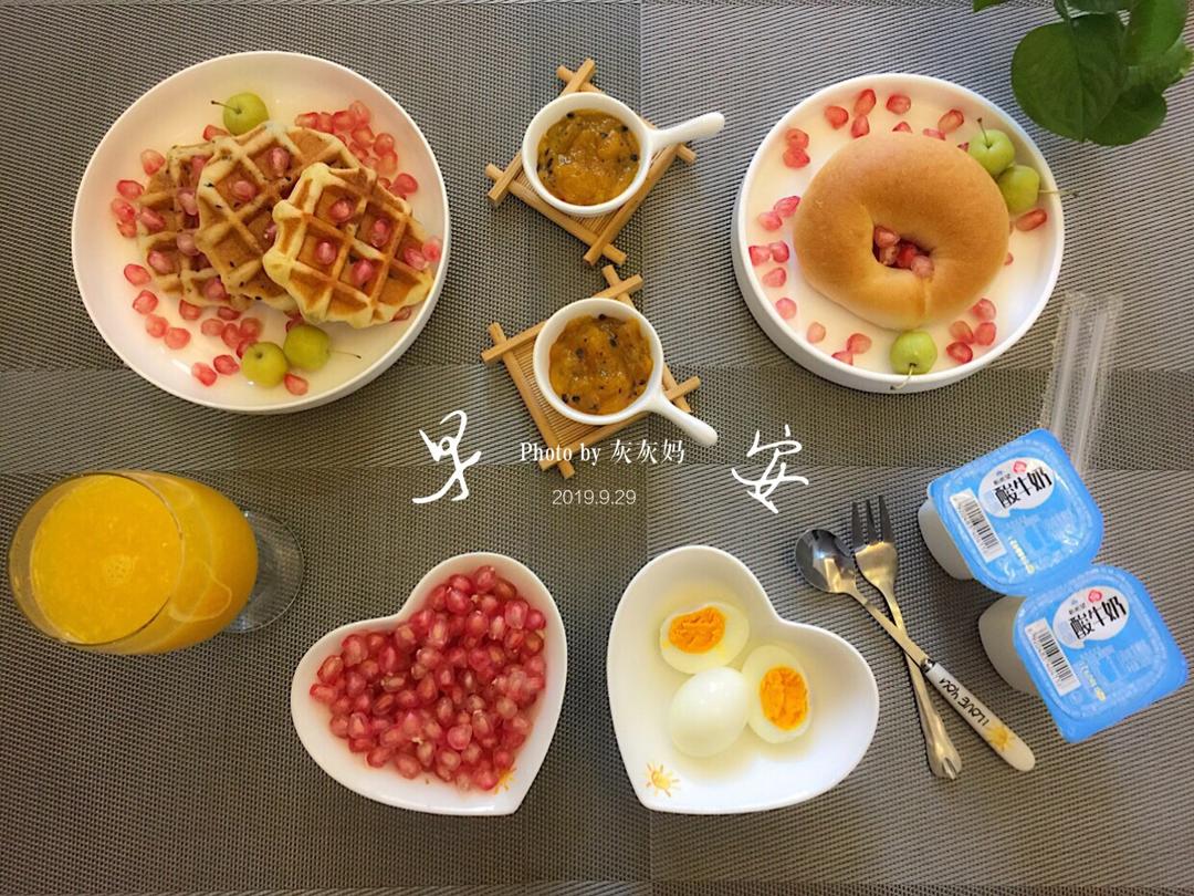 小灰灰妈麻 做过 早餐•2018年9月29日 #早餐•2018年9月29日#周六,工作日日常忙碌模式,再忙也要好好吃早餐!早餐标配水煮蛋,每天必吃!原味贝果,空口吃嚼劲爆棚亦是十分美味,最爱之一!酵母版黑蜜豆华夫饼,嚼劲与贝果有一拼,皆是我爱的口感!鲜榨橙子汁,橙香扑鼻,石榴剥出籽,用勺挖着吃超过瘾,水果中最爱的便是石榴了!忙碌的一天,早餐吃好吃饱才是王道!满满的能量搬砖也格外的有劲😄😄😄! 2018-09-29