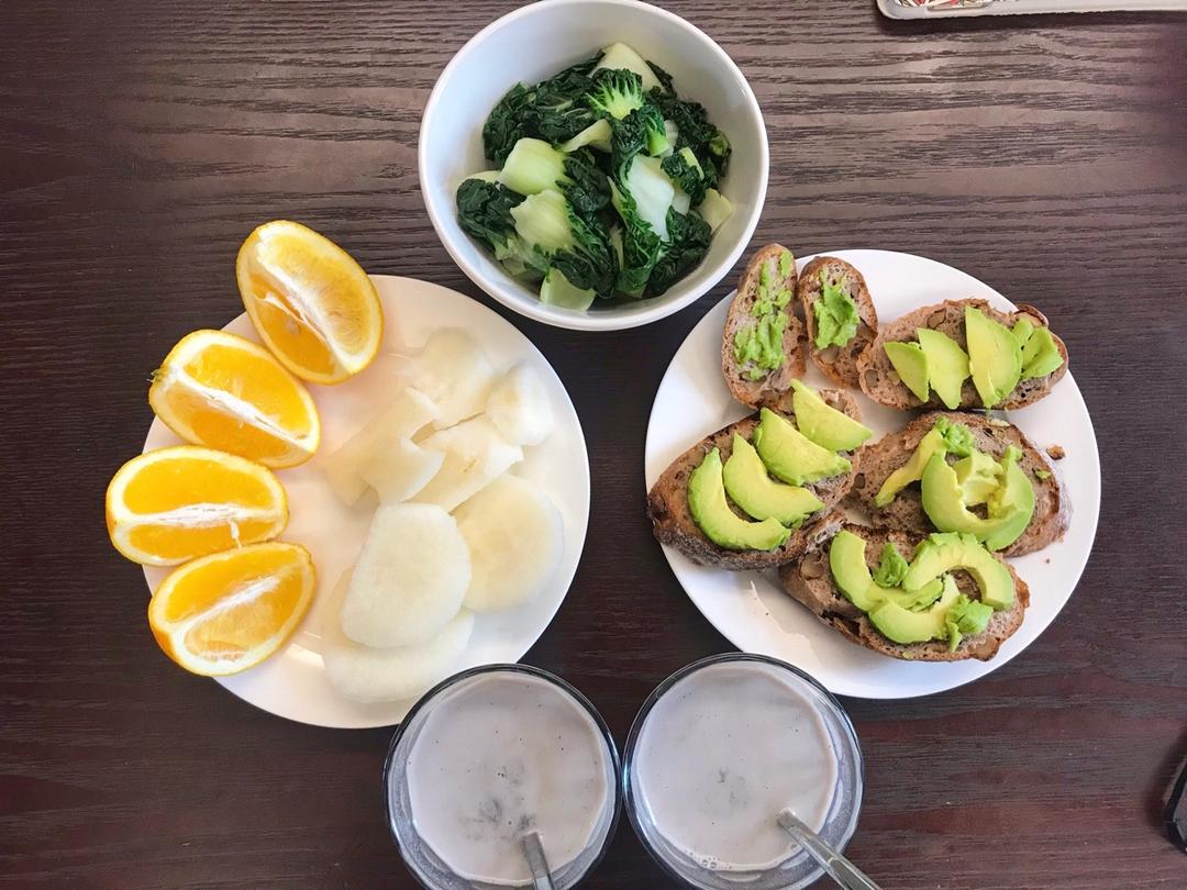 炒白菜、牛油果核桃面包、橙、梨和黑芝麻牛奶
