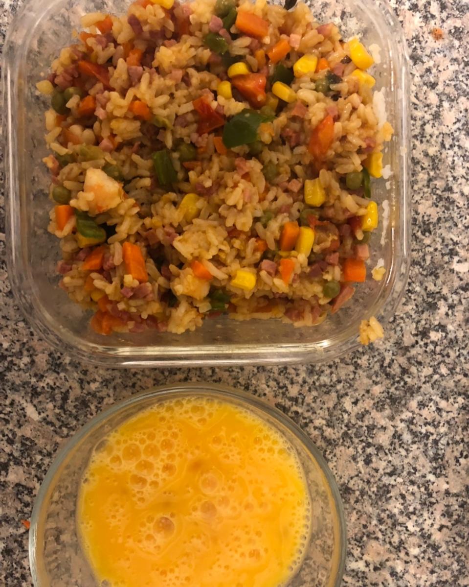 无敌丑的版本,下车重做。用了火腿肉,虾肉,胡萝卜,青豆和玉米粒。
