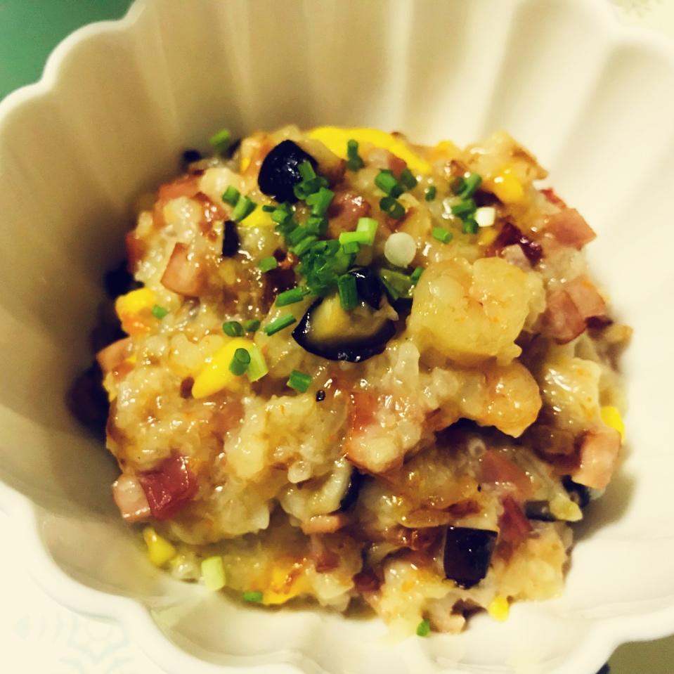 虾仁香菇玉米胡萝卜青豌豆,嗯,糯米饭