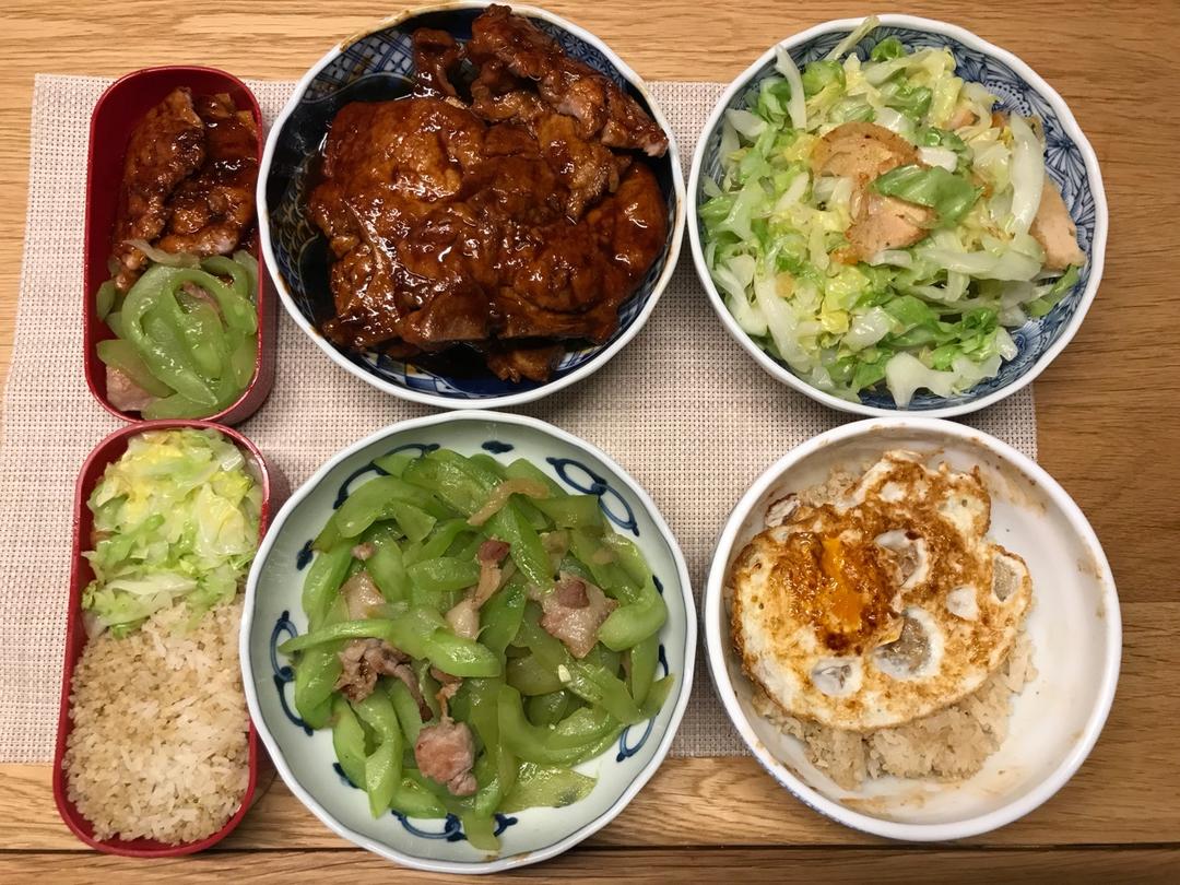红烧大排,圆白菜炒烧肉,黄瓜榨菜炒肉,荷包蛋,藜麦饭