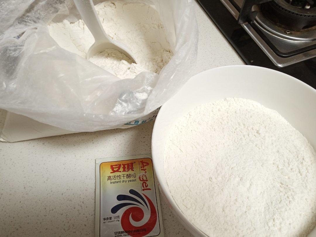 原料,中筋面粉500克。酵母4克,温水250克。葱两颗。