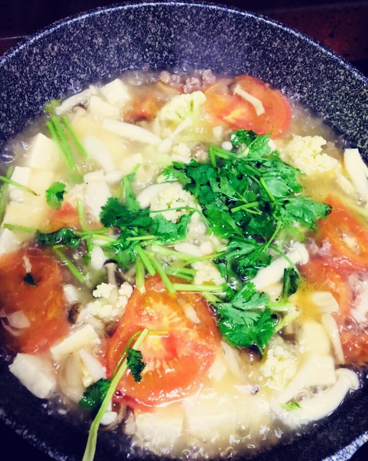 花菜西红柿菌菇豆腐肉沫汤
