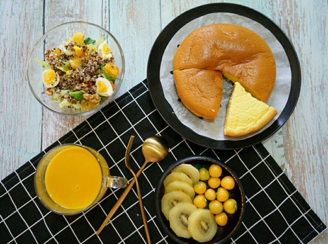 藜麦核桃蔬菜色拉,电饭煲蒸蛋糕,牛奶玉米南瓜汁,水果。