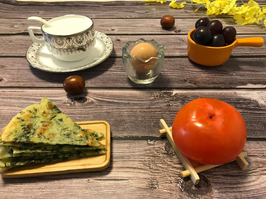 忙完孩子们上学,也给自己做了一份营养早餐,菠菜鸡蛋饼,鲜牛奶,柿子,葡萄。