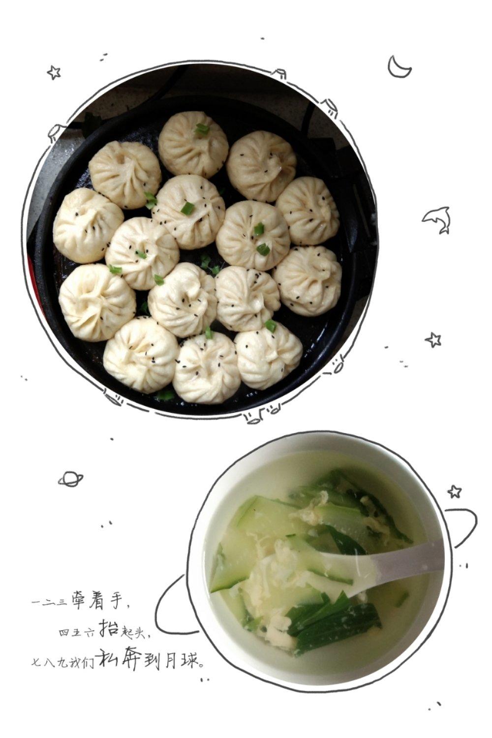 邻居家送莲藕做的猪肉大葱馅水煎包十青菜汤。