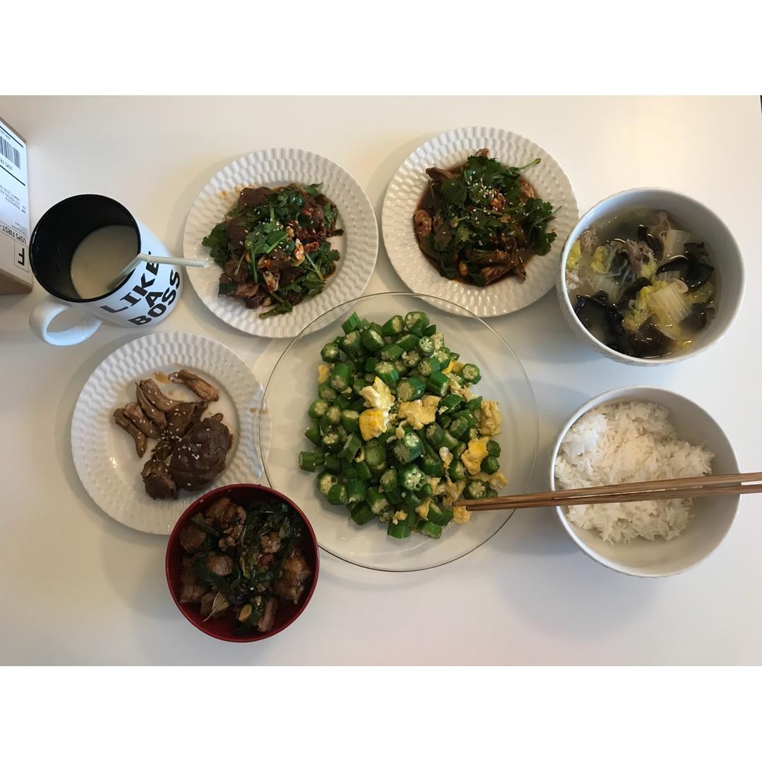 麻辣牛健 麻辣鸭舌 辣卤鸭舌 辣卤牛腱 葱烧排骨 羊肉白菜木耳粉丝汤 秋葵炒蛋