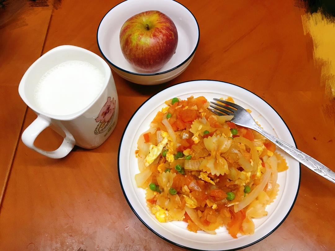 今日早餐:番茄鸡蛋洋葱豌豆炒意面&牛奶&🍎