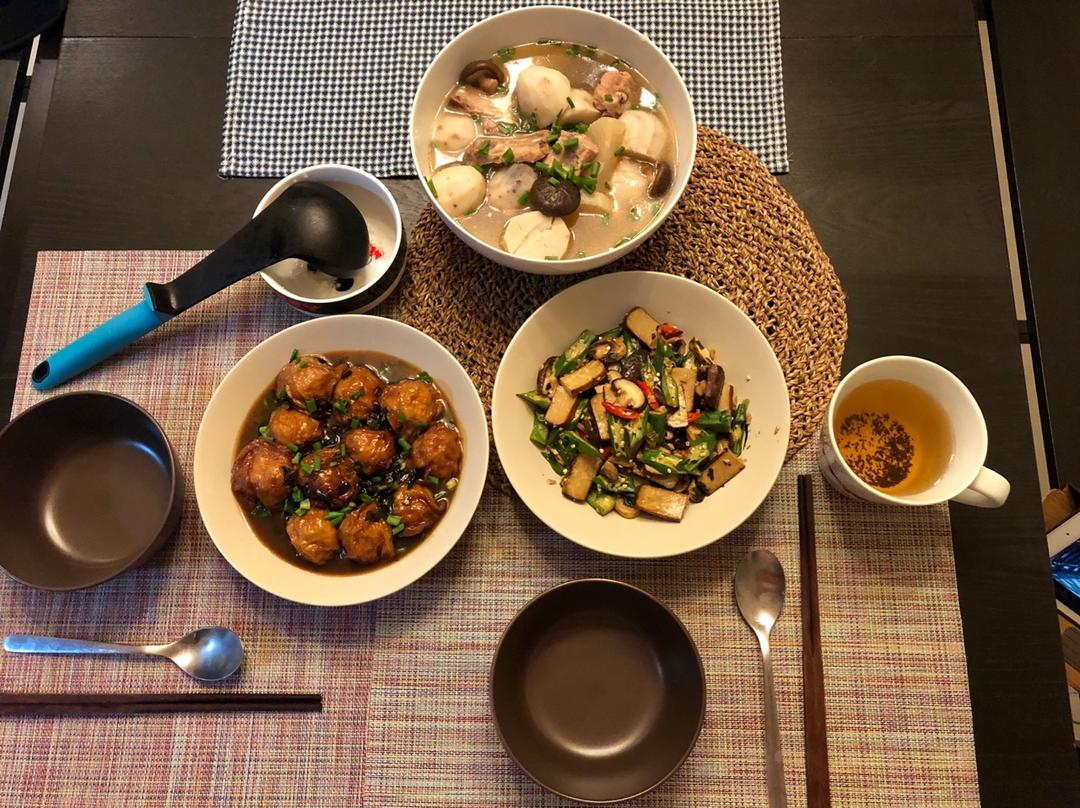 紅燒油面筋塞肉•蒜炒秋葵•芋艿排骨湯
