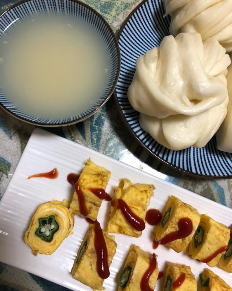 秋葵蛋厚烧,小米清粥,花卷