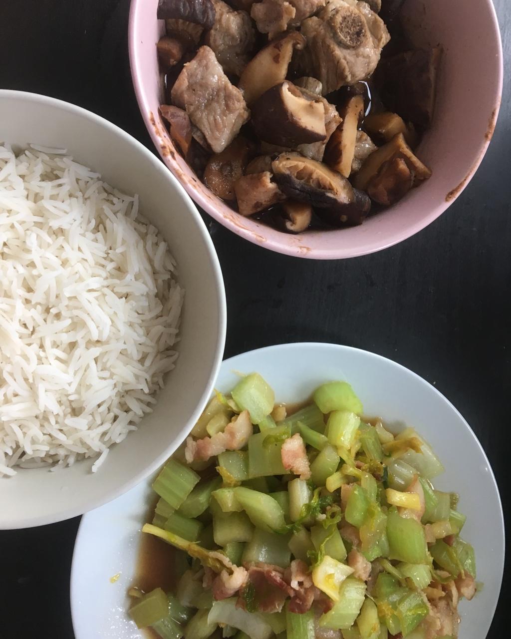蒸排骨配香菇,培根炒芹菜,因为室友修空调下午才吃上午饭