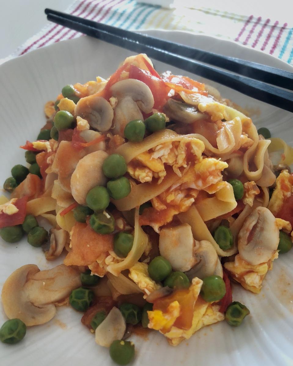 番茄蘑菇豌豆鸡蛋面。好吃