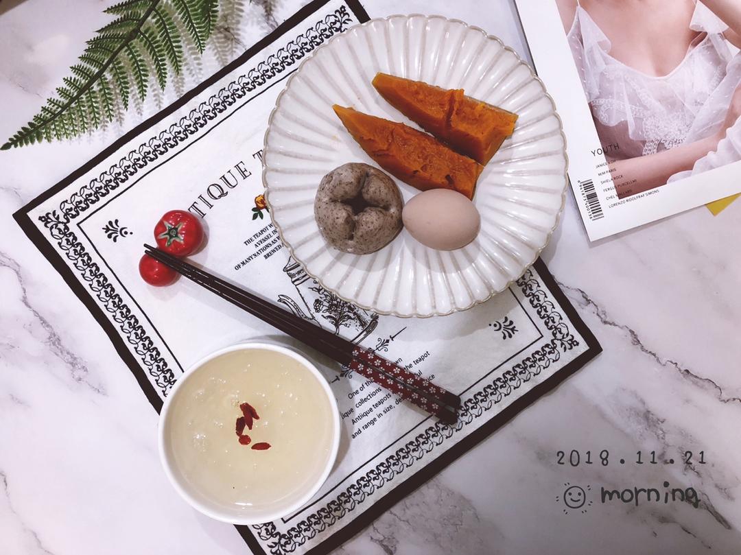 蒸南瓜🎃➕紫薯包➕白煮蛋➕清炖燕窝,冬日早晨需要吃点热乎的[哈哈]