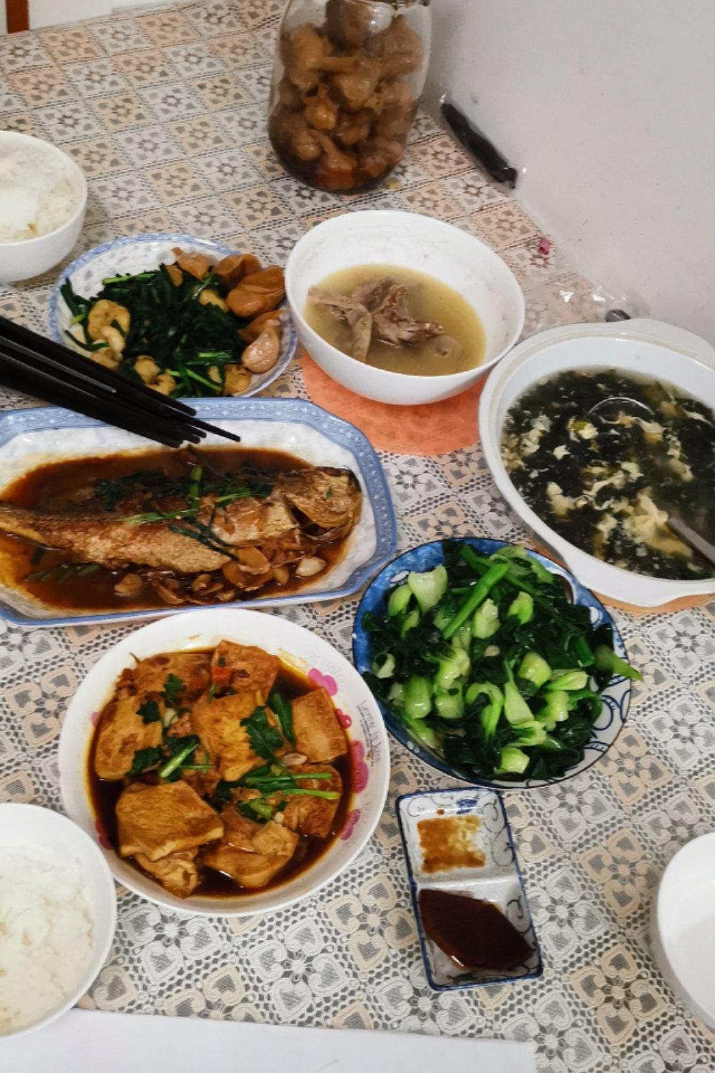 20181208晚餐【红烧黄鱼】【小上海青】【蟹黄豆腐】【韭菜河虾仁】【紫菜蛋花汤】【鸽汤】
