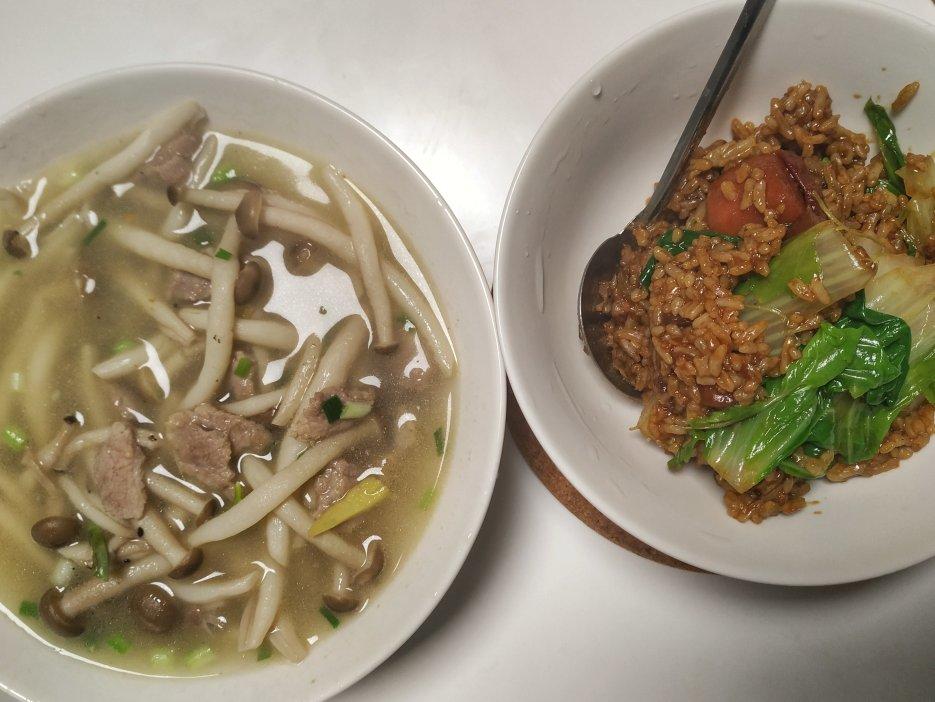 红烧肉汁拌饭,蟹味菇肉片汤。
