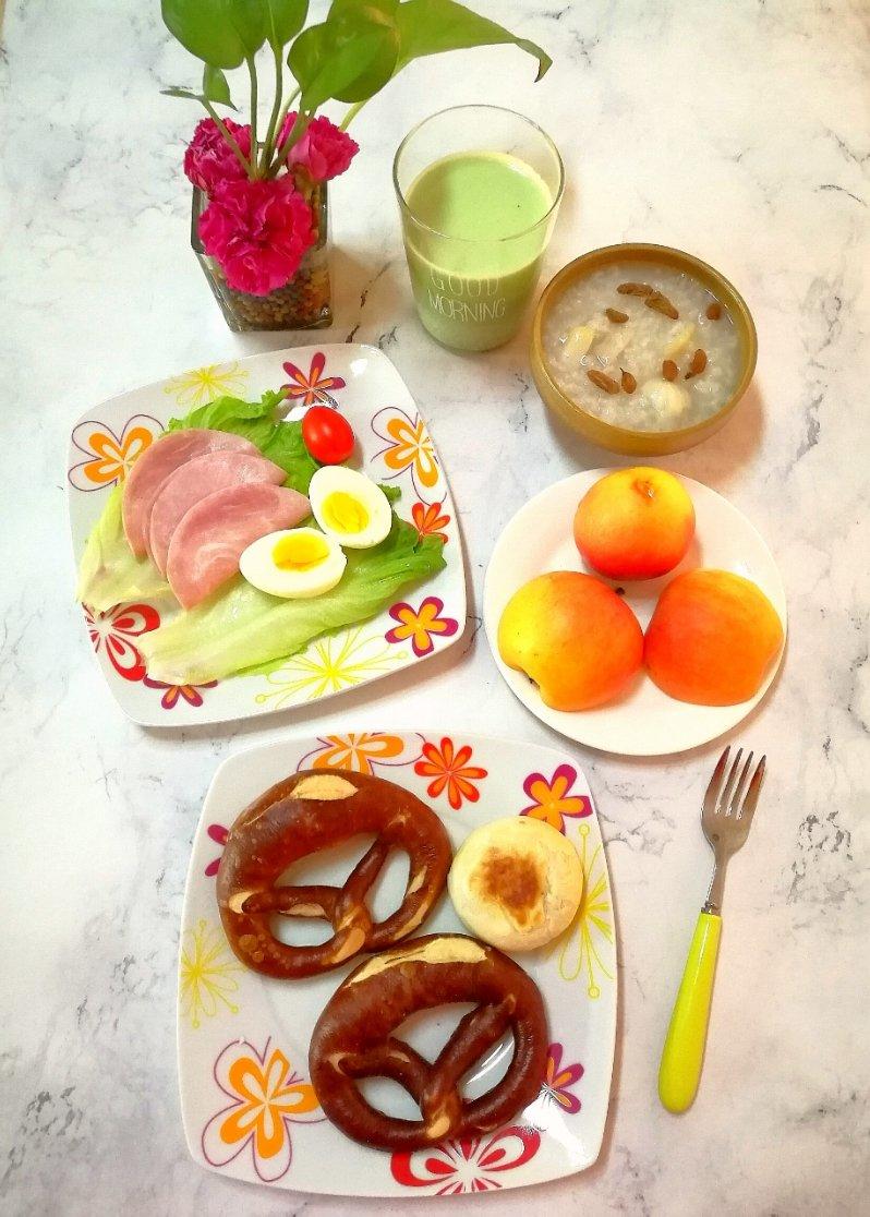 yogapeng 做过 早餐•2018年12月10日 #早餐•2018年12月10日# #德国碱水面包# 新周早安☀️早餐:最后两个碱水包+鸡蛋肠+水果+芋头粥+抹茶奶🍽忙碌的年终终于告一段落,长长舒口气😅 2018-12-10
