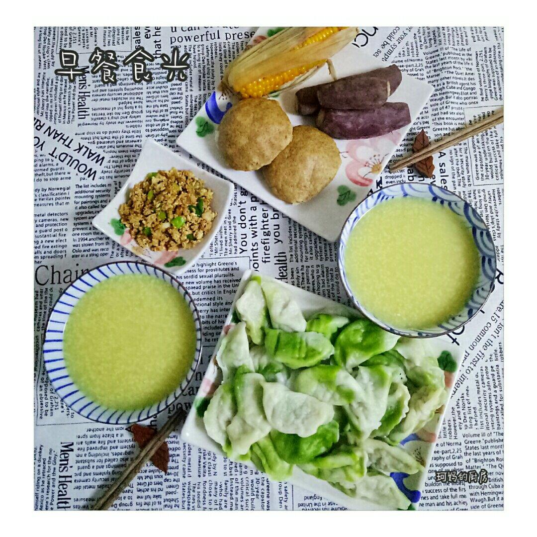 小米玉米碴子粥+饺子+窝窝头+鸡蛋炒酱