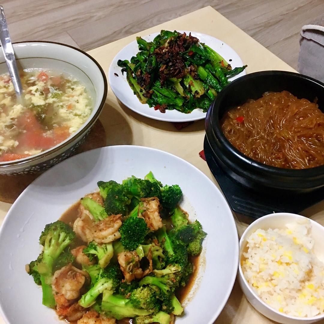 蚝油虾球西兰花 肉末粉丝煲 豆豉鲮鱼油麦菜 番茄蛋花汤