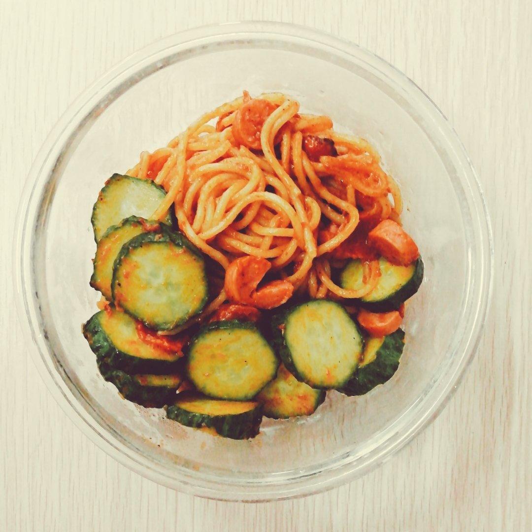 黄瓜番茄烤肠意面,第一次做意面放了黄油,味道不错,但好像放多了,下次克制一点,满满的脂肪啊