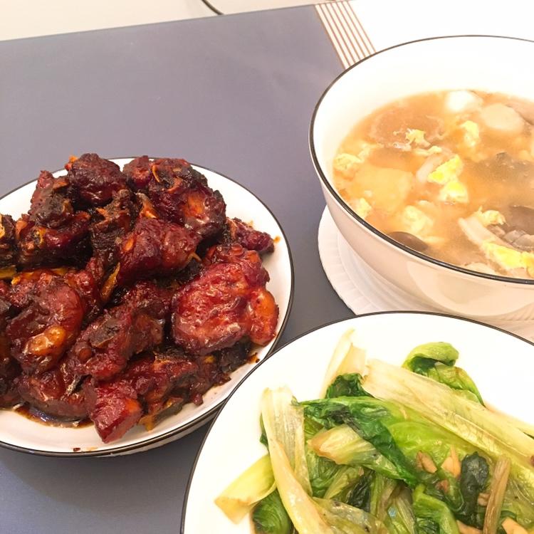 糖醋排骨比烧排骨麻烦好多啊!!糖有点多了口味有点重,就顺手做了蘑菇鸡蛋汤