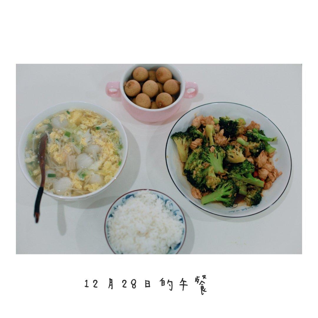 初蕊 做过 午餐•2018年12月28日 #午餐•2018年12月28日# #偶尔一人食# #丫头下厨记# 一人食。中午吃西兰花炒鸡胸肉,金针菇鱼丸蛋汤,水果龙眼,图3是今日份的200天的可以独坐的小哆啦!终于,满200天啦!!😆😆😆 2018-12-28