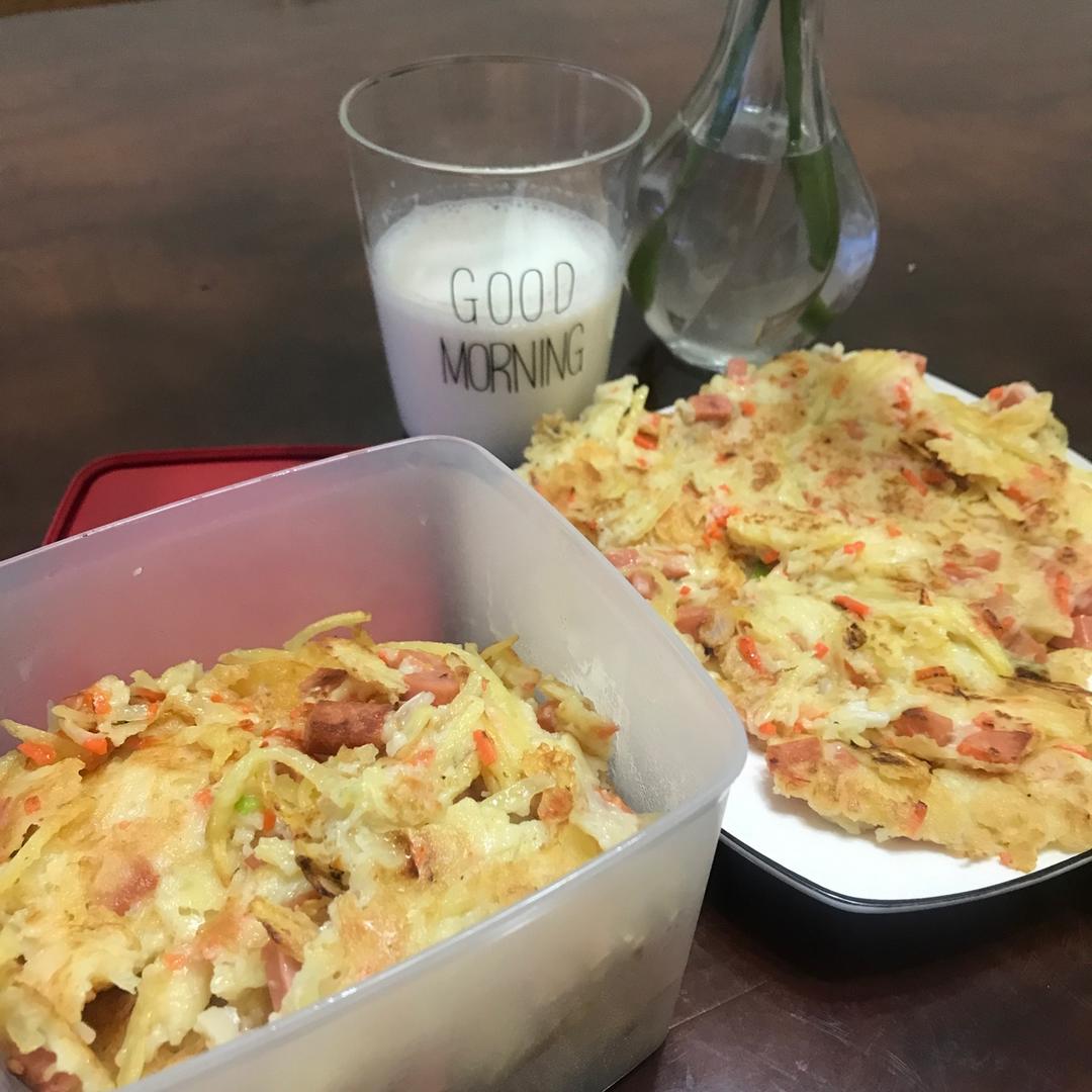 早餐~土豆丝饼配牛奶 一张就很饱啦