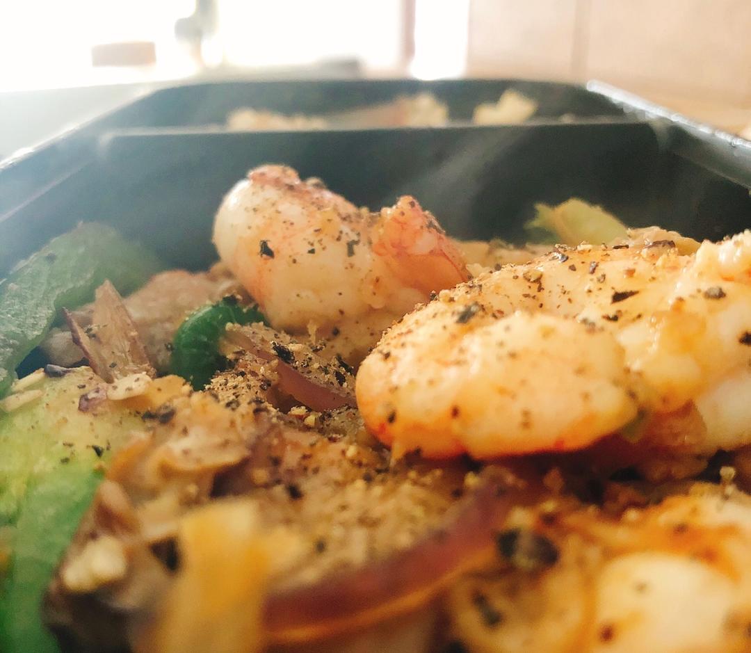 甜椒杂菌炒虾+糙米饭。今日份减脂餐🤨